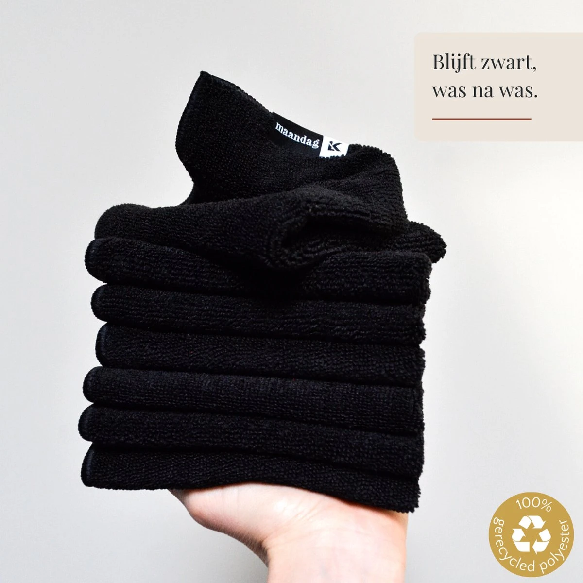 De vaatdoekjes zijn gemaakt van 100% gerecycled polyester in een extra dikke kwaliteit (300gr). Waar goedkope schoonmaakdoekjes verkleuren en steeds dunner worden, zullen de Dagelijks Doekjes hun kleur en kwaliteit behouden. Zelfs na keer op keer wassen blijven ze mooi zwart en dik.